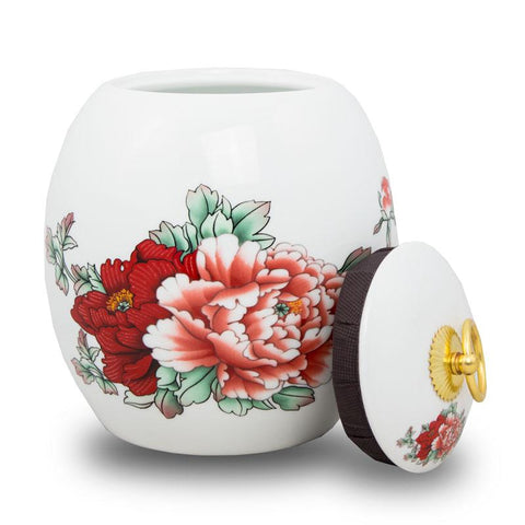 These exquisitely designed ceramic urns available in two sizes that are bit smaller than a standard size urn. Copper plated ring handle accents the lid. Liquid adhesive is included to secure the lid.