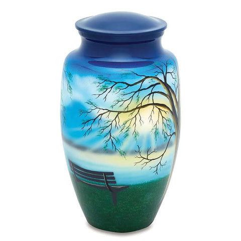 These classically shaped urns are crafted from solid metal by the ancient process of sand casting. The urns are hand-painted in unique designs and then topped with a lacquer coating to preserve the brilliant design. Due to the nature of the creation process, each urn is somewhat unique, and the design may vary slightly from the photos. This means your urn is truly a one-of-a-kind treasure perfect for honoring the life of your one-of-a-kind loved one.