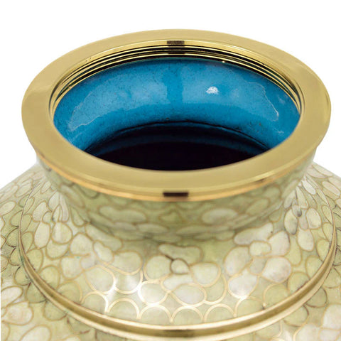The Opal Flowers Cloisonné Urn is a beautiful way to celebrate the life of a loved one. The Cloisonné pattern features an intricate floral pattern with golden-hued outlines in a gentle opal background. The golden bronze of the lid and trim around the neck of the urn will catch your eye, gently reminding you of all the love you shared. The Opal Flowers Cloisonné Urn features a threaded lid to secure closure.