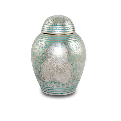 This delicately etched nickel plated urn features a teddy bear design. After etching, skilled artists lovingly apply paint into the etching by hand. The plating gives the urn a metallic highlight to accent the teddy bear. The urn features a threaded lid so that it closes securely.