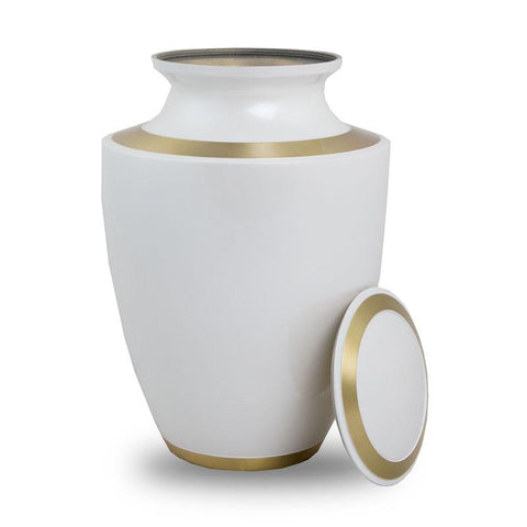 This contemporary bronze urn is finely finished to a high gloss sheen with metallic paint of the highest quality. The design is accented with pewter banding to make it suitable for display. This urn would make the perfect tribute for any life well lived. Pewter banding accents the edging of the lid and base. Threaded lid for a secure closure. Engraving available.