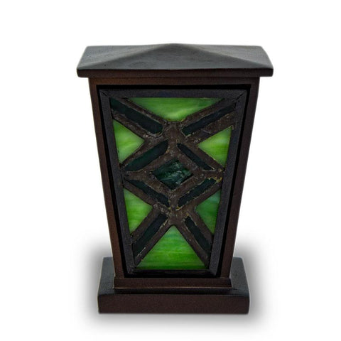 This lovely keepsake urn features a stained glass panel on the front that is handcrafted using Tiffany-style techniques. It is supported by a durable resin casing that is solid on the sides. A small amount of cremation ash is stored in the stained glass compartment with the opaque resin ensuring that the contents are secure. The back of the keepsake urn can be engraved for personalization.