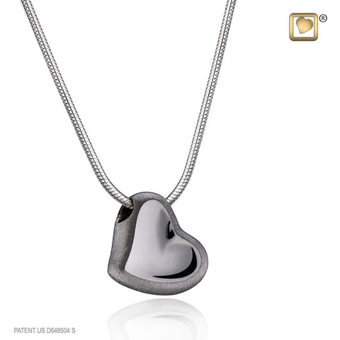 Classically elegant, the Two-Tone Black Ruthenium Plated Leaning Heart™ Necklace offers the ideal way to create a memory of a loved one to keep close to your heart. The tiny secure compartment can be filled with a pinch of cremated remains, a lock of hair, a flower petal, or some other small item that you’d like to keep near. The pendant floats on a 20” sterling silver chain and is delivered in a beautifully crafted black presentation box. Complete instructions and a filling kit are included.