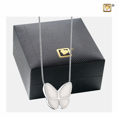 The Wings of Hope Butterfly Keepsake Cremation Pendant Necklace offers a beautiful, yet discrete, way to keep a remembrance of your loved one close to your heart. It is also perfect for sharing and gift-giving. This lovely pendant necklace with its glimmering butterfly evokes the peace and beauty of transformation. Your pendant comes with an 18” sterling silver chain and is lovingly packaged in an elegant box. Includes a filling and care kit.
