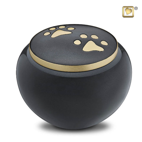 The Classic Cuddle™ Pet Urn helps you create the perfect tribute to your precious furry family member. Its rich midnight finish is hand-engraved with paw prints and brushed accents to offer a simple yet loving memorial that is perfect for display or burial. Available in three sizes.