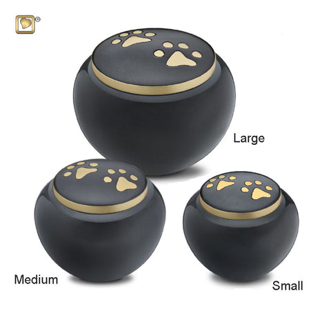 The Classic Cuddle™ Pet Urn helps you create the perfect tribute to your precious furry family member. Its rich midnight finish is hand-engraved with paw prints and brushed accents to offer a simple yet loving memorial that is perfect for display or burial. Available in three sizes.