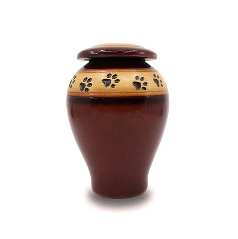 The Loving Paw Prints Auburn Pet Urn features a design that evokes the connection between the natural earth and the spirit of the animal world. The rich reddish brown color is handpainted and fired at high temperatures to create a lovely glossy texture. The urn’s body features a tan-colored band embossed with paw prints. This careful detail is mirrored on the lid as well. The Auburn Loving Paw Print is available in three sizes to help you create the perfect final resting place for your companion.