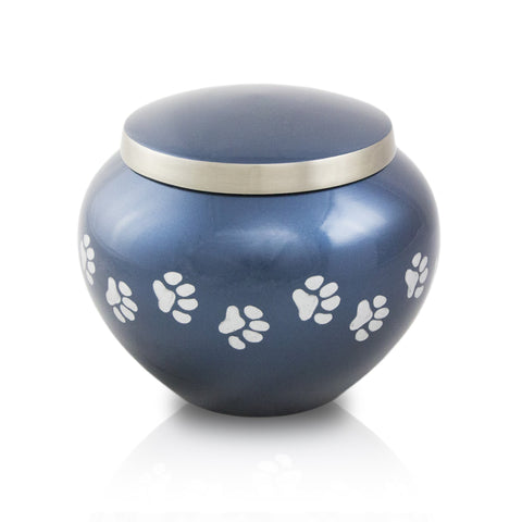 The Odyssey Paw Print Band Urn is the perfect way to pay tribute to your beloved pet. The paw prints surrounding the urn add a whimsical remembrance of the many steps you shared and the memories you made together. These urns are suitable for both dogs and cats and with a size available for most animals. Its simple design makes it available to display in any décor. For personalization, engraving is available.